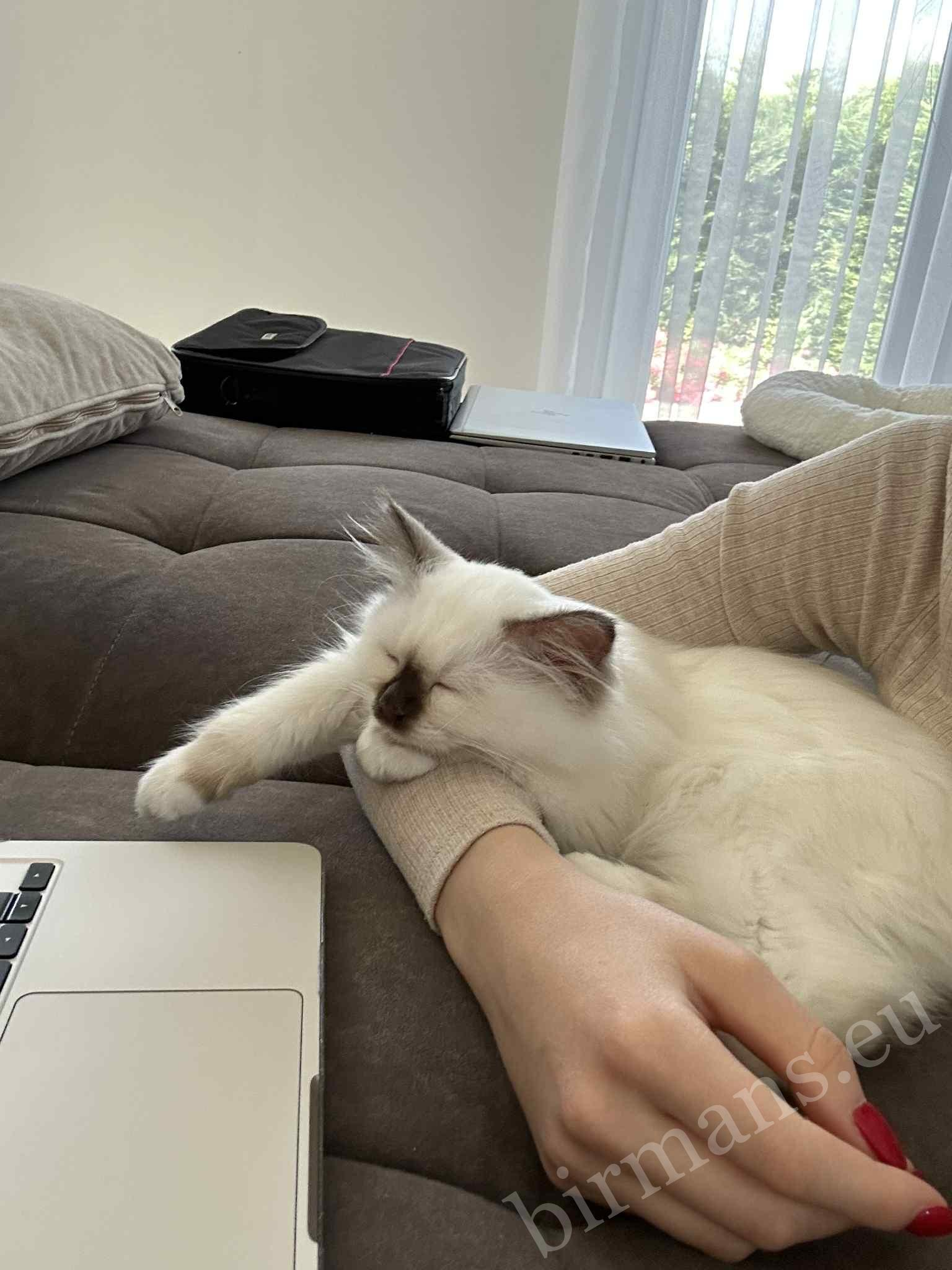 Un moment silencieux entre Gigi et sa propriétaire. Le Chat Sacré de Birmanie endormi sur les genoux, reposant en sécurité, montre exactement ce lien profond et calme qui est l’une des plus belles qualités de la race.