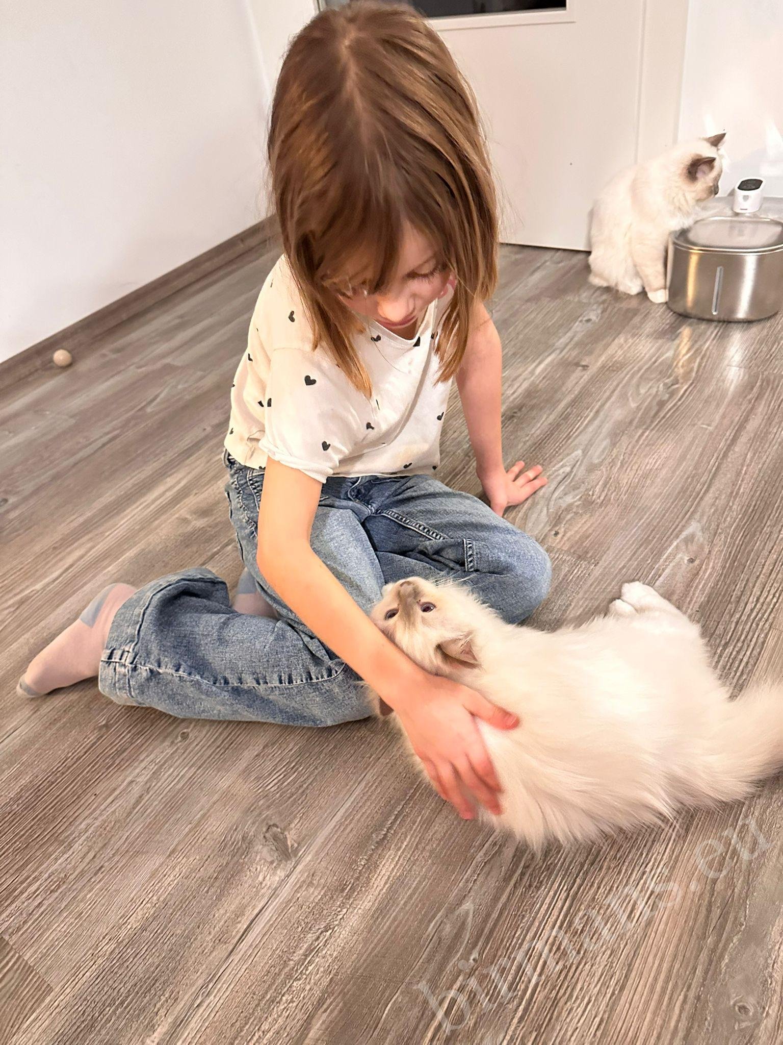 C’est dans de tels moments que l’on voit vraiment avec quelle naturalité le chat Saba Birman devient partie intégrante de la famille : il se connecte délicatement aux humains, aux enfants, et vit en harmonie avec d’autres animaux également.
