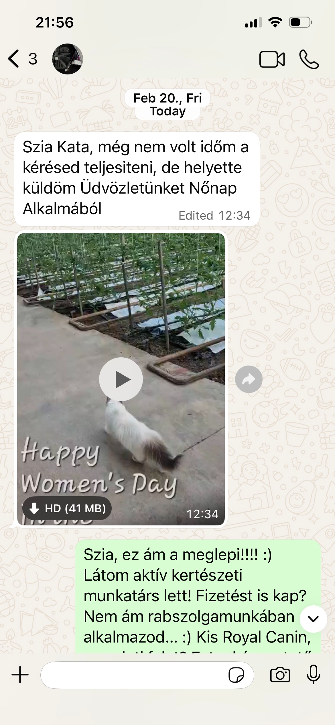 Le propriétaire de Serenity, Gabriel, a envoyé une courte vidéo montrant le chat l’accompagnant dans la serre pendant son travail. La vidéo est arrivée comme cadeau pour la Journée de la femme — un petit message sur la façon dont Serenity est devenue partie intégrante du quotidien.