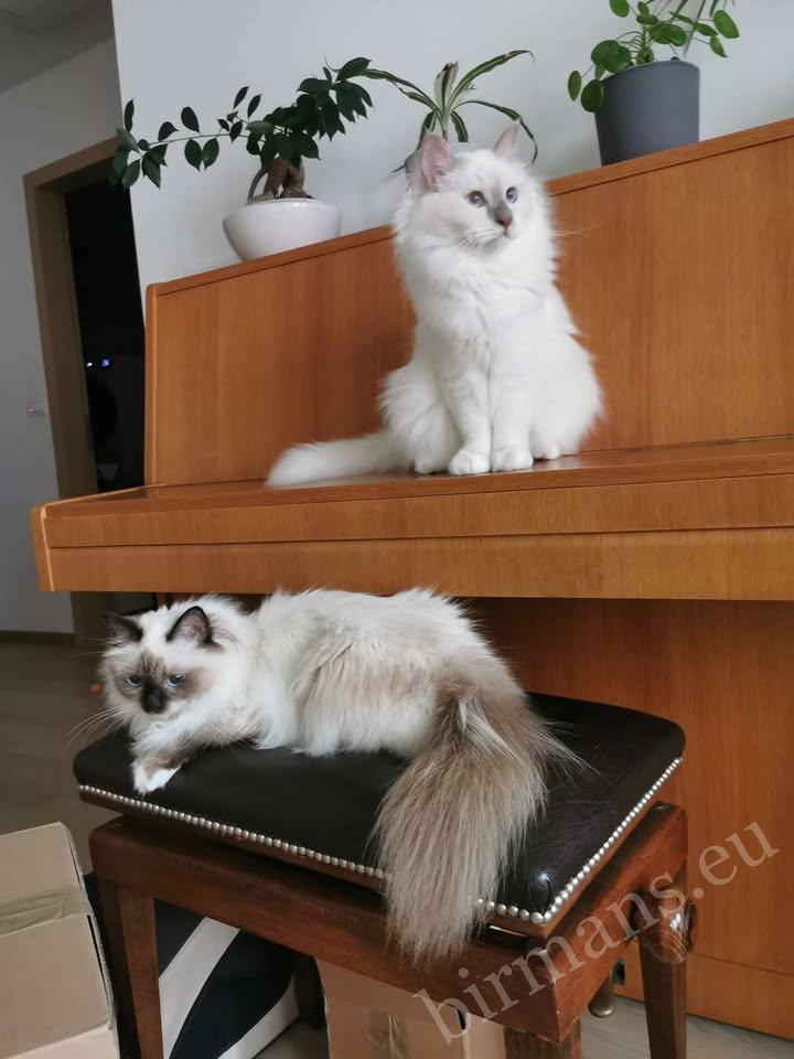 Perla et Casper devant le piano — deux magnifiques chats Saba Birman qui grandissent ensemble en Slovénie.