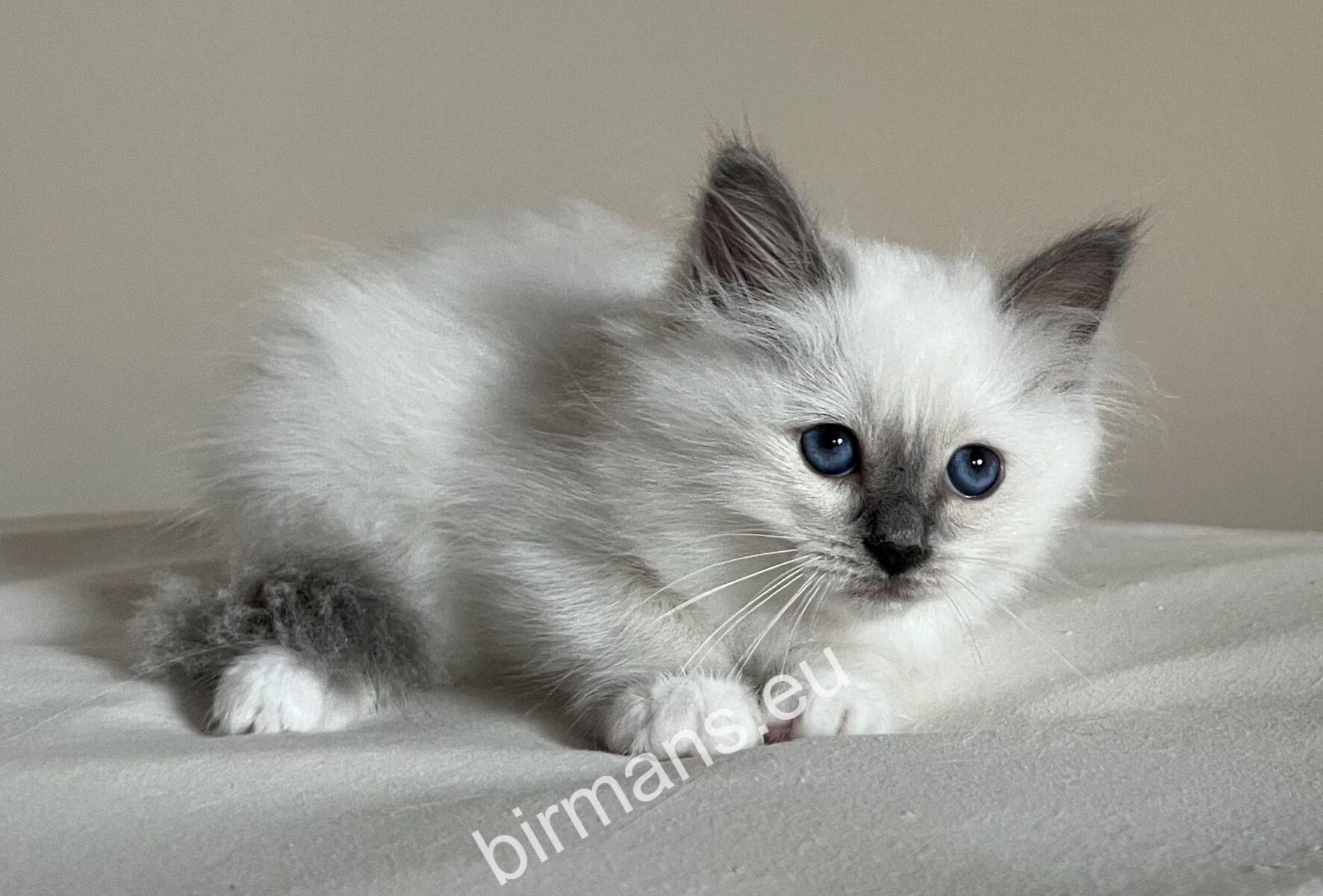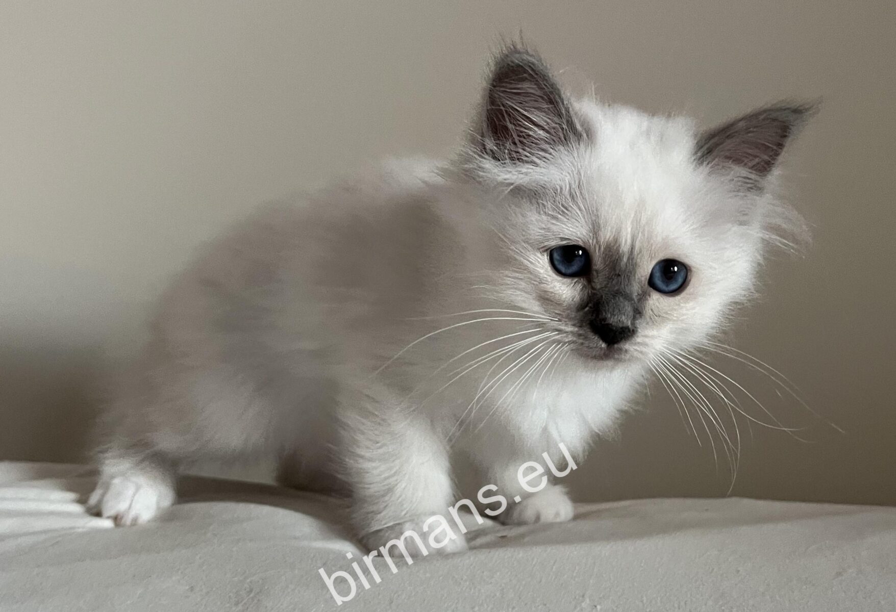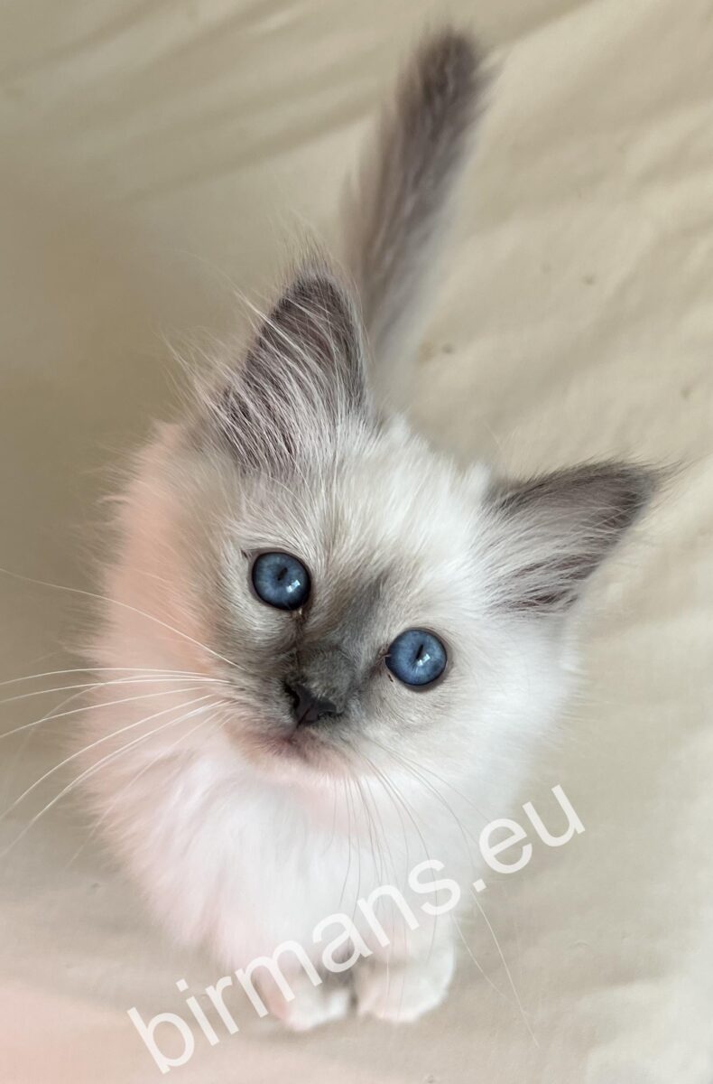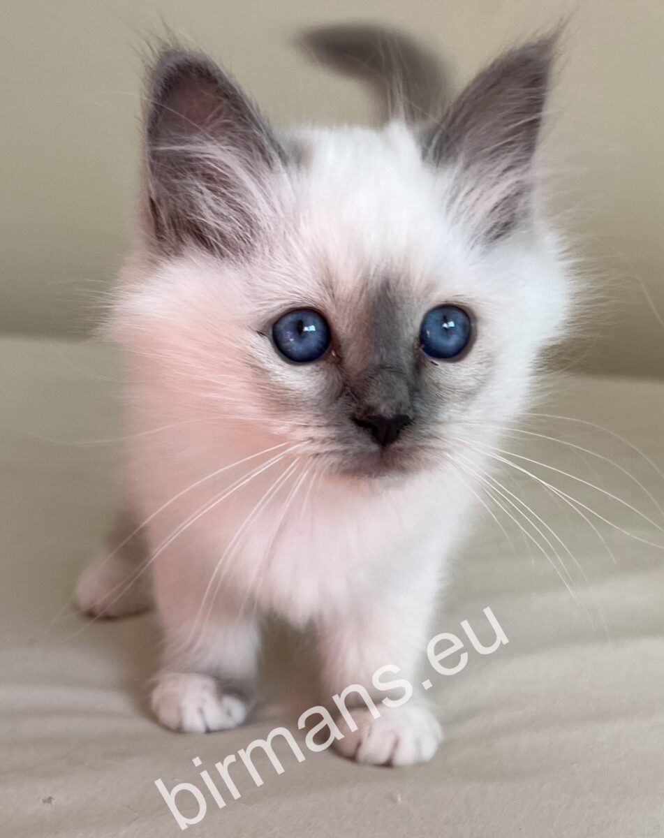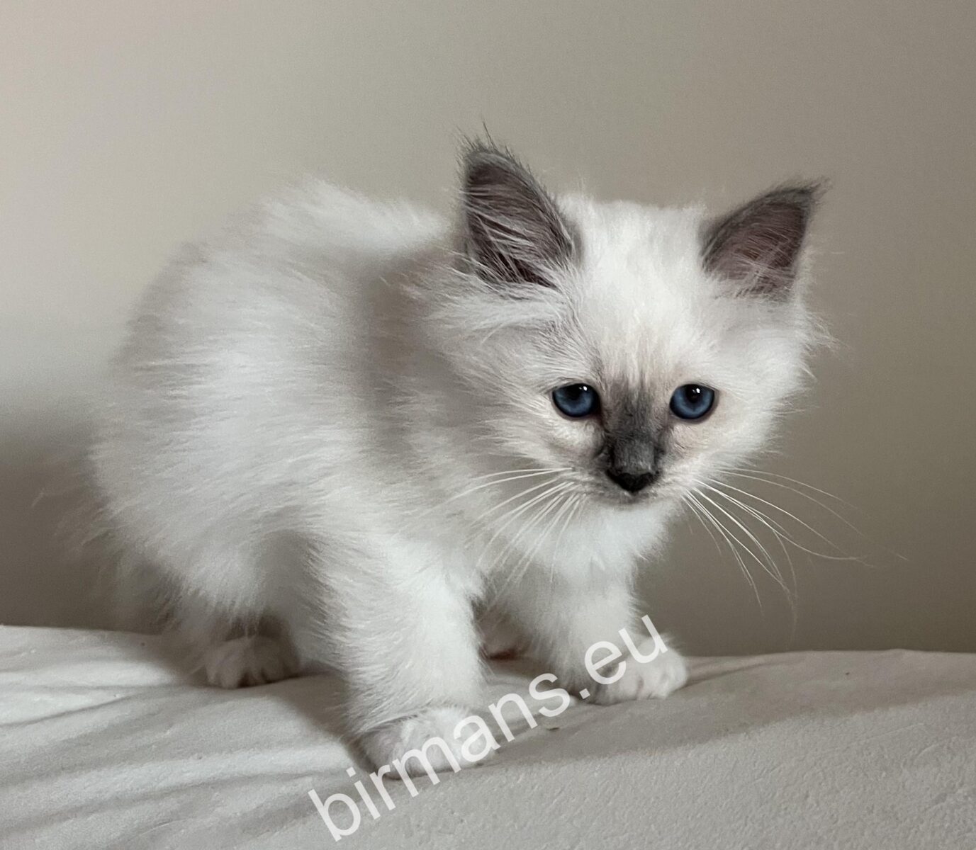 Cette perle porte la beauté distinguée de la variété Birman avec une perfection étonnante : son motif de points bleus et ses notes de présentation raffinées sont impressionnants en eux-mêmes. Bien qu’il semble réticent au début, lorsqu’il se calmera, il se jettera à terre – et votre cœur – pour un petit câlin. C’est le choix idéal pour les éleveurs qui recherchent une qualité exceptionnelle et pour ceux qui se préparent à une carrière dans l’exposition, pour qui le calme et l’élégance sont importants.