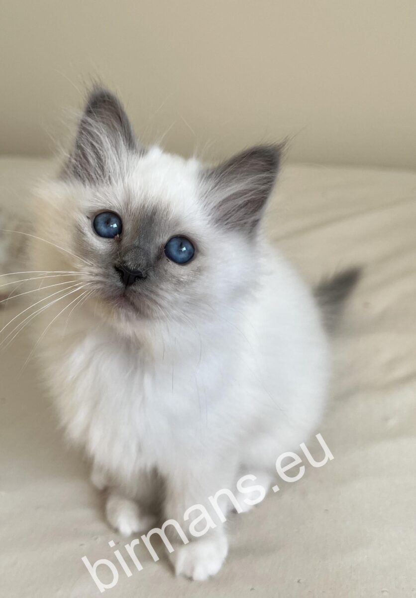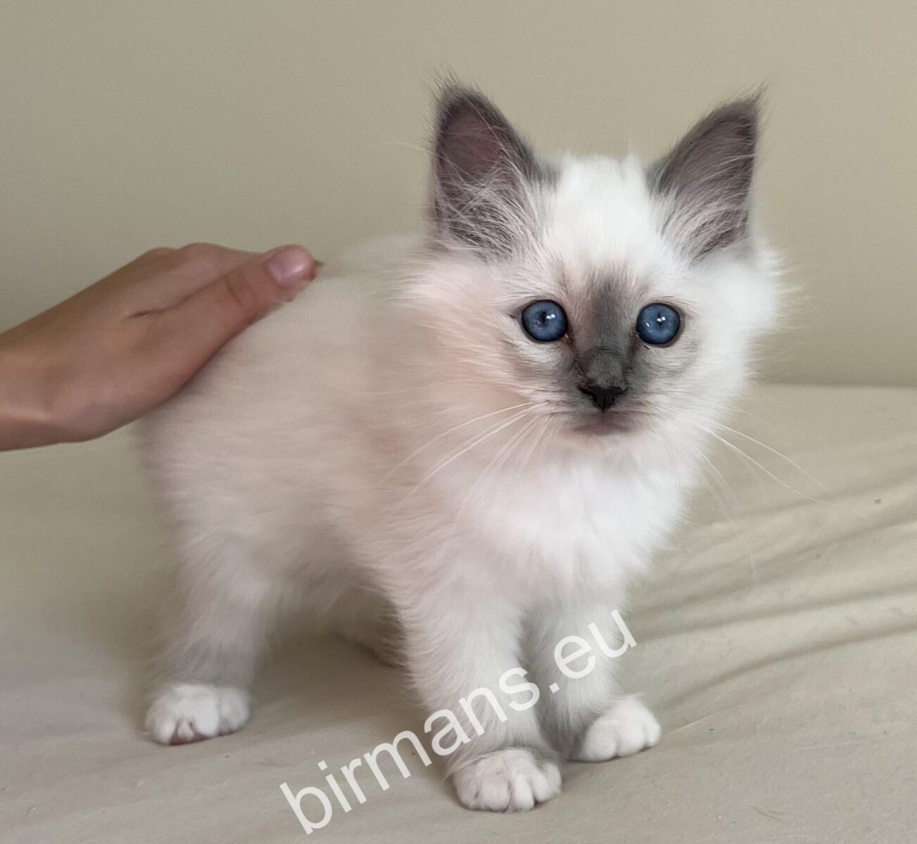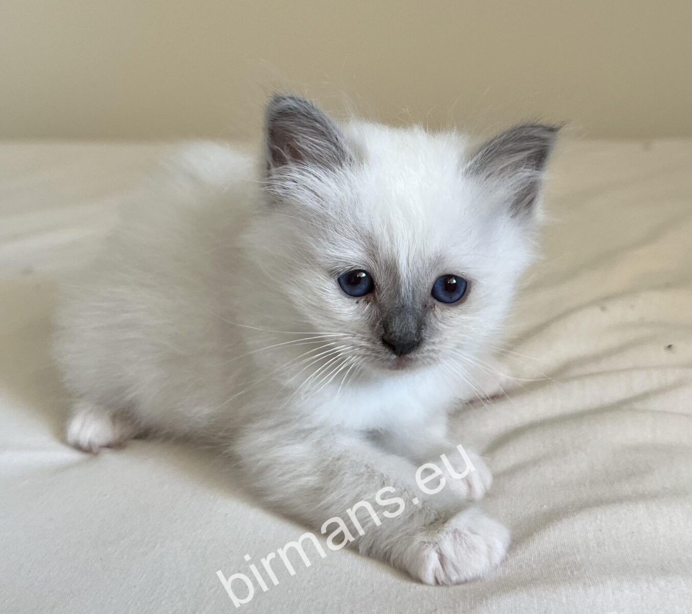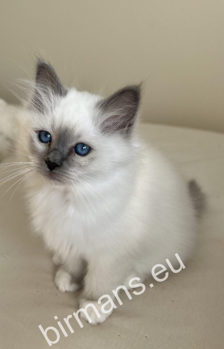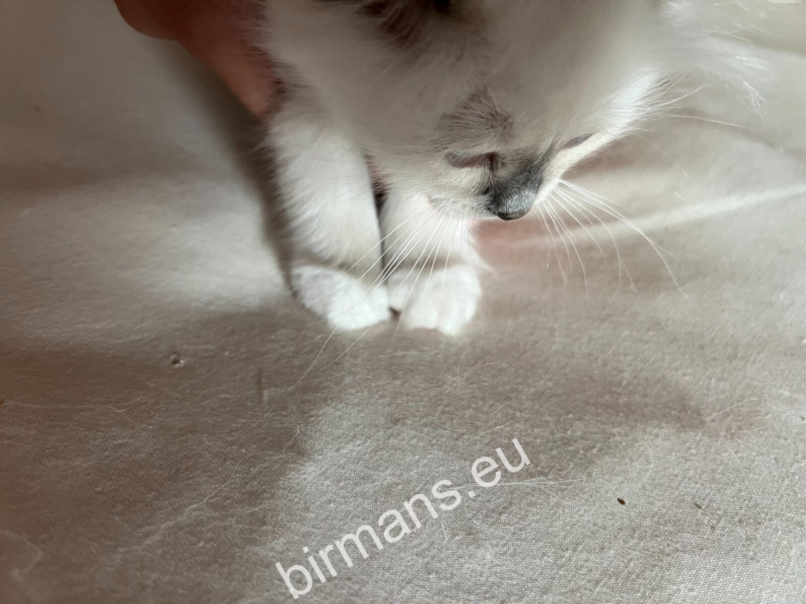 Cette perle porte la beauté distinguée de la variété Birman avec une perfection étonnante : son motif de points bleus et ses notes de présentation raffinées sont impressionnants en eux-mêmes. Bien qu’il semble réticent au début, lorsqu’il se calmera, il se jettera à terre – et votre cœur – pour un petit câlin. C’est le choix idéal pour les éleveurs qui recherchent une qualité exceptionnelle et pour ceux qui se préparent à une carrière dans l’exposition, pour qui le calme et l’élégance sont importants.