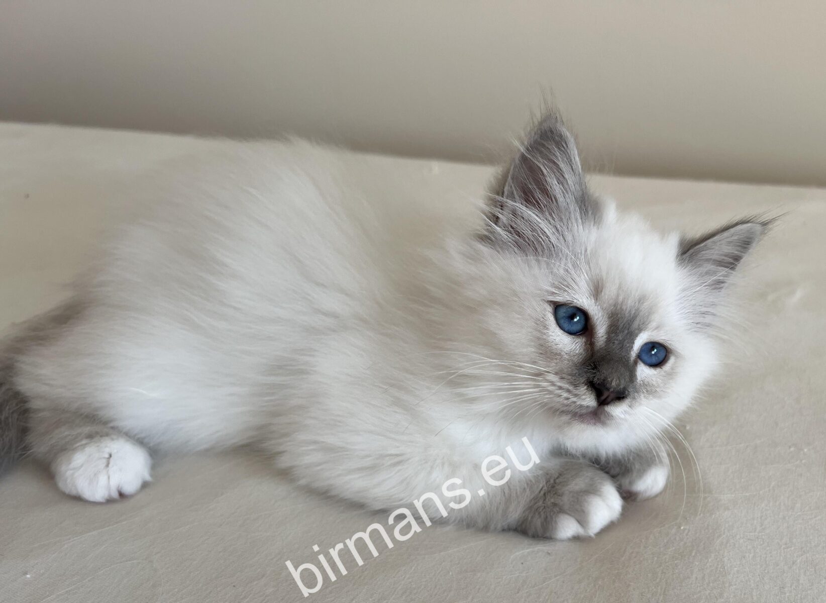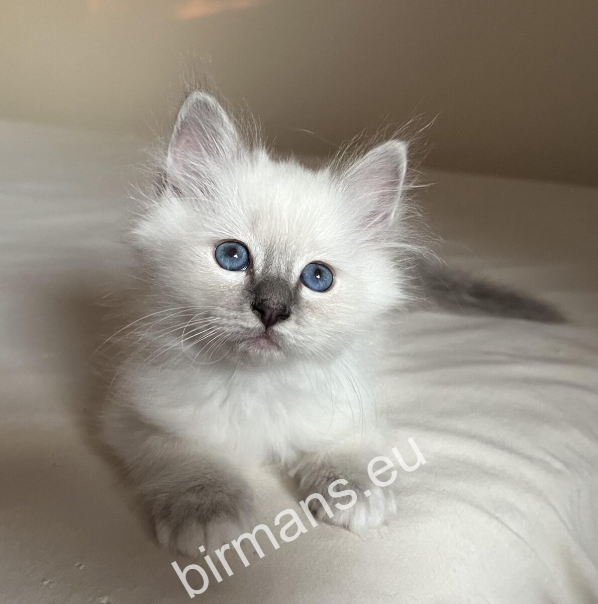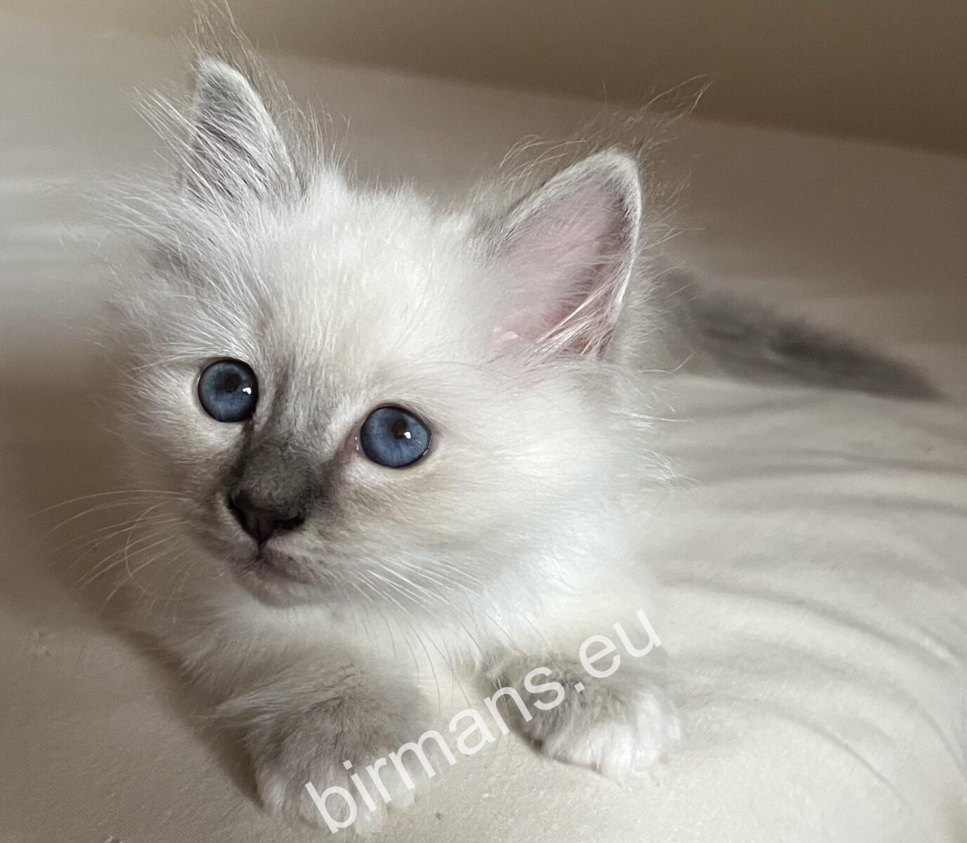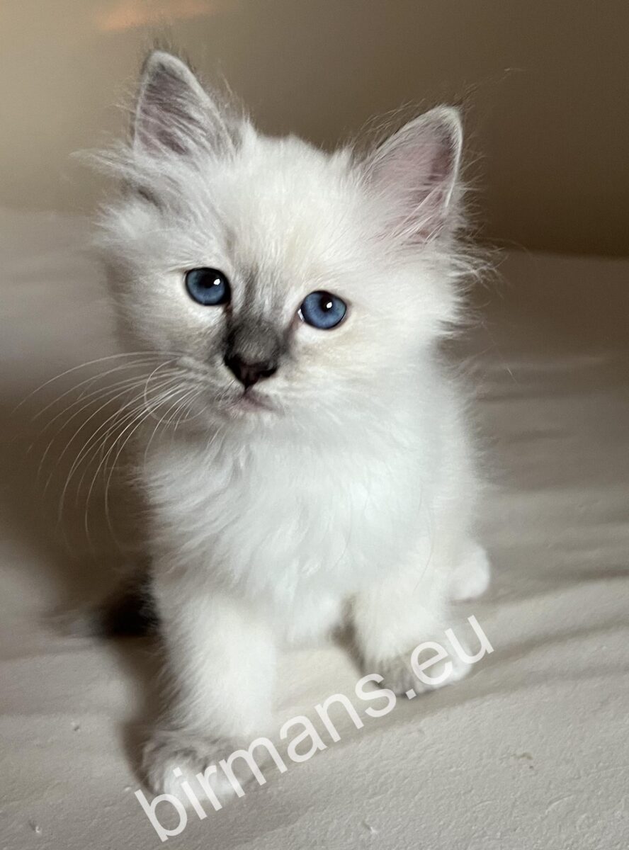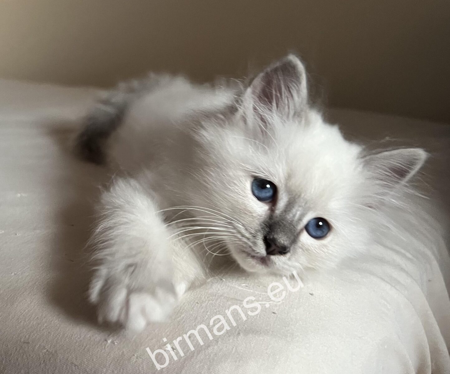 Avec son tempérament joyeux et sa curiosité ludique, Saba Nolan apportera déjà un sourire à votre journée. Il a été le premier à découvrir la portée et à la montrer à ses frères et sœurs comme un outil pédagogique – un vrai leader dans une petite boule de poils. Ses yeux inquisiteurs, son doux pelage bleu tabby et sa nature affectueuse font de lui le parfait compagnon de qualité du chat Birman.