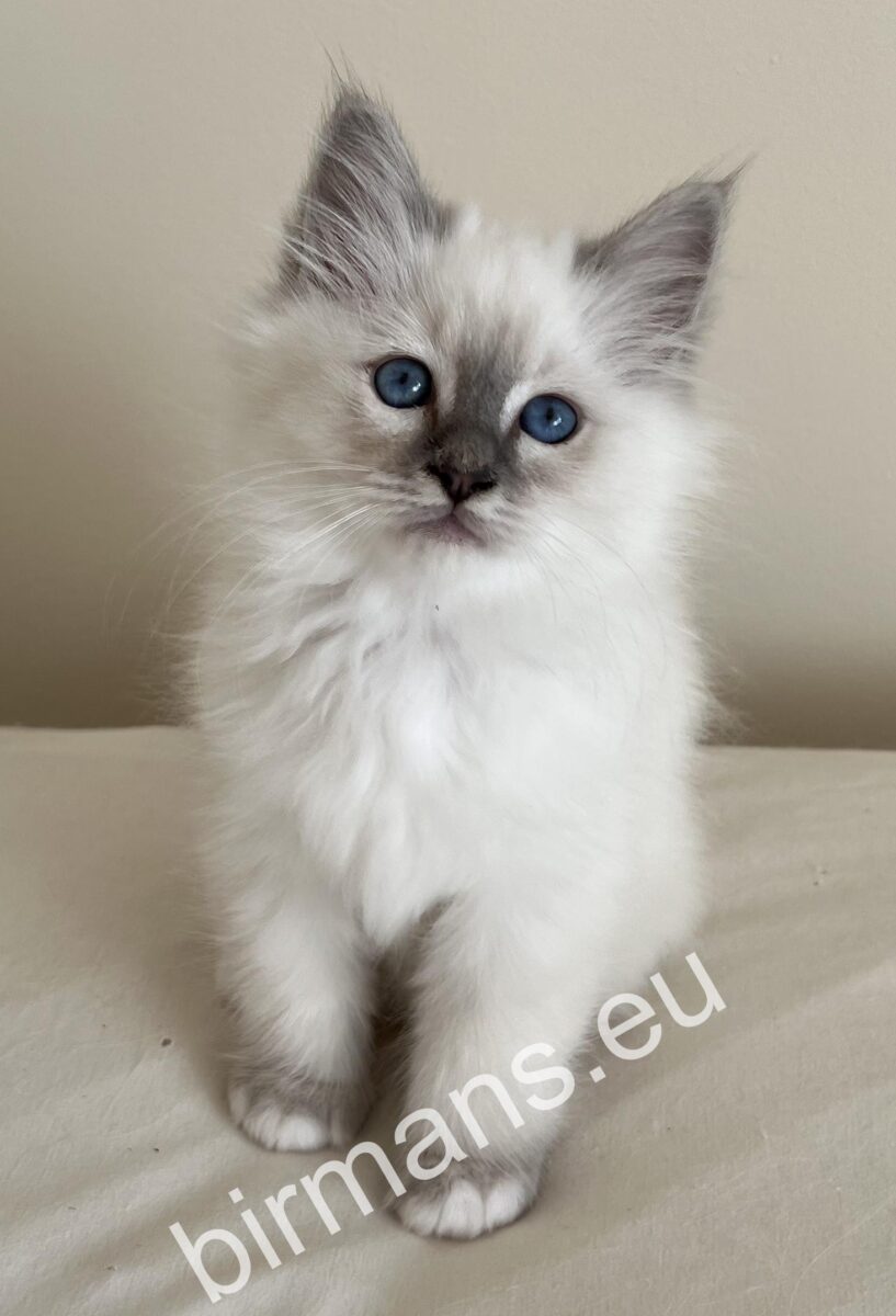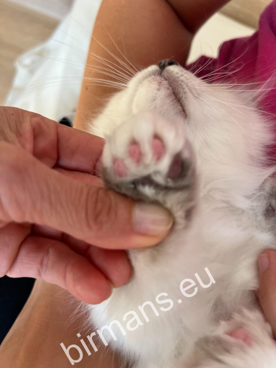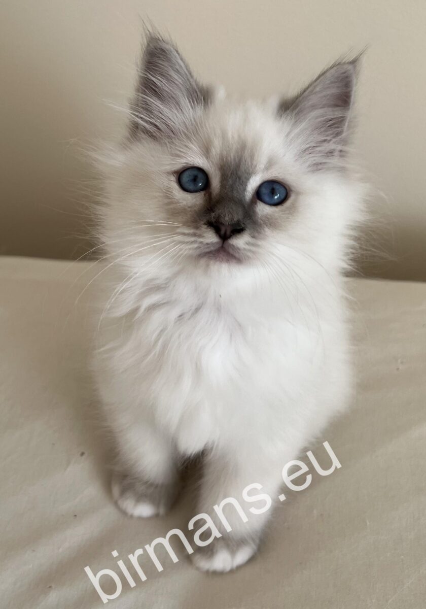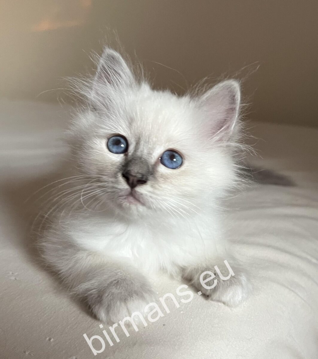 Avec son tempérament joyeux et sa curiosité ludique, Saba Nolan apportera déjà un sourire à votre journée. Il a été le premier à découvrir la portée et à la montrer à ses frères et sœurs comme un outil pédagogique – un vrai leader dans une petite boule de poils. Ses yeux inquisiteurs, son doux pelage bleu tabby et sa nature affectueuse font de lui le parfait compagnon de qualité du chat Birman.