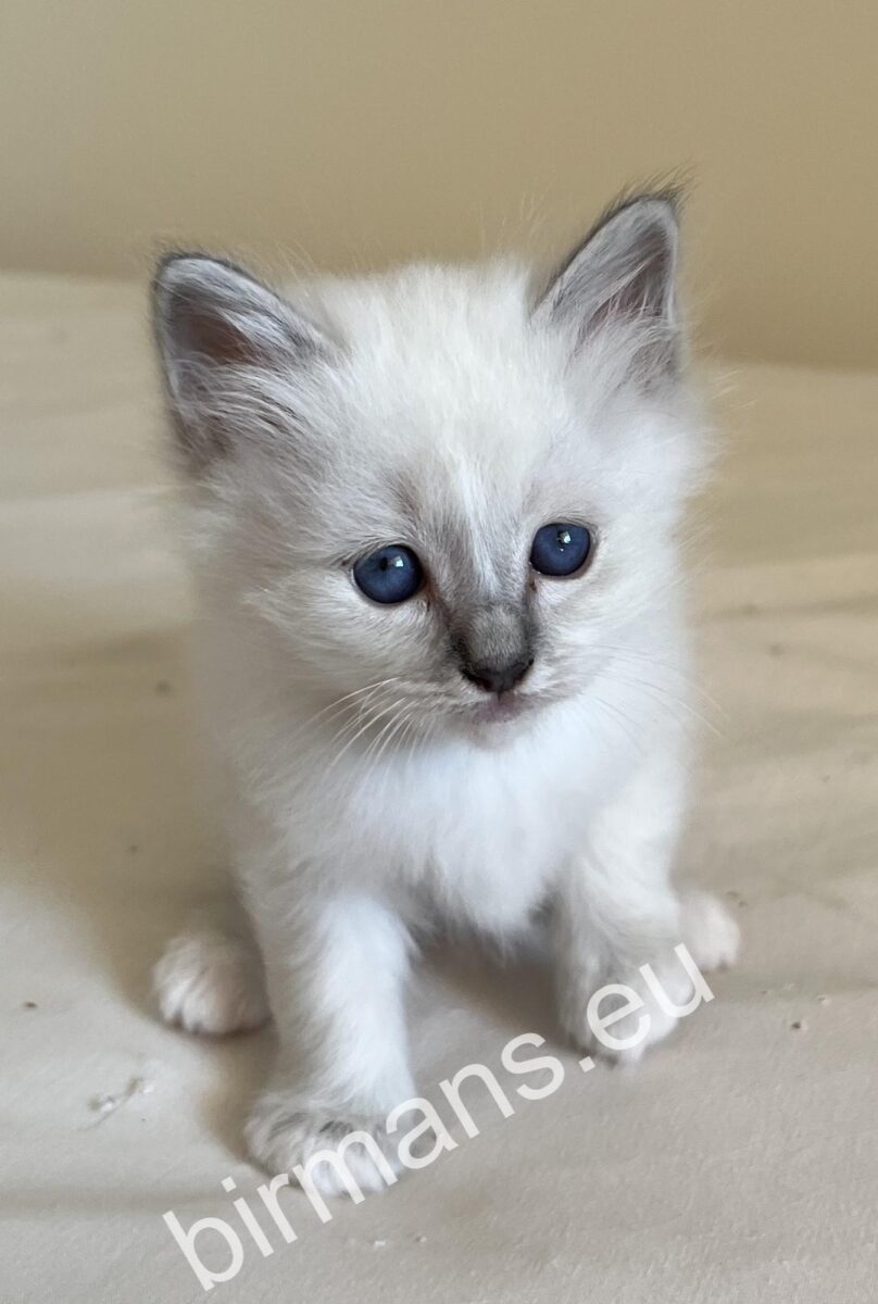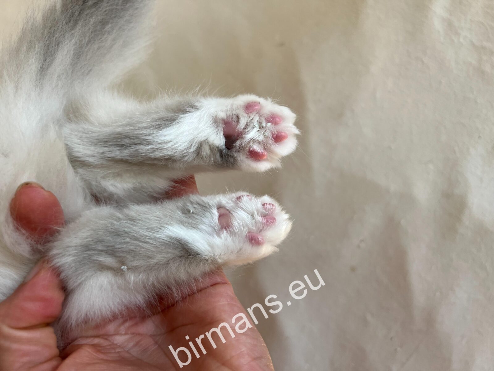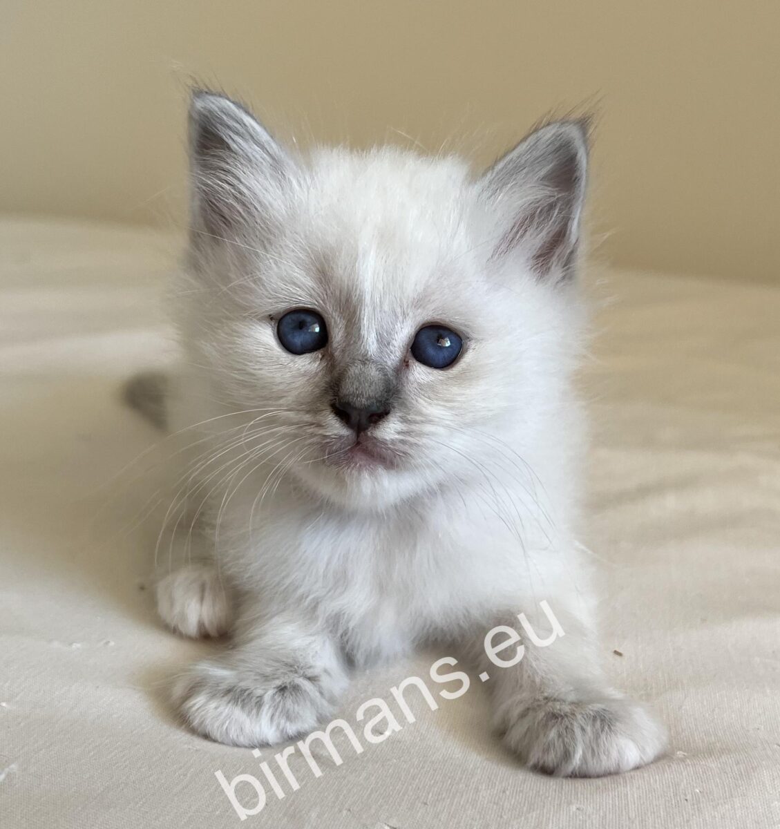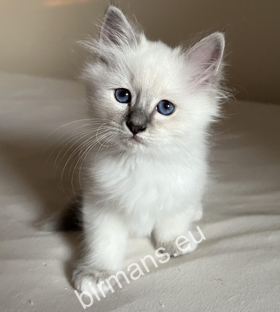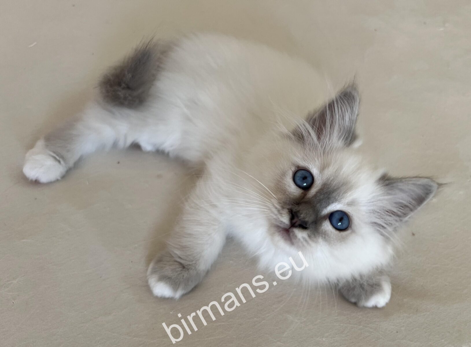 Avec son tempérament joyeux et sa curiosité ludique, Saba Nolan apportera déjà un sourire à votre journée. Il a été le premier à découvrir la portée et à la montrer à ses frères et sœurs comme un outil pédagogique – un vrai leader dans une petite boule de poils. Ses yeux inquisiteurs, son doux pelage bleu tabby et sa nature affectueuse font de lui le parfait compagnon de qualité du chat Birman.