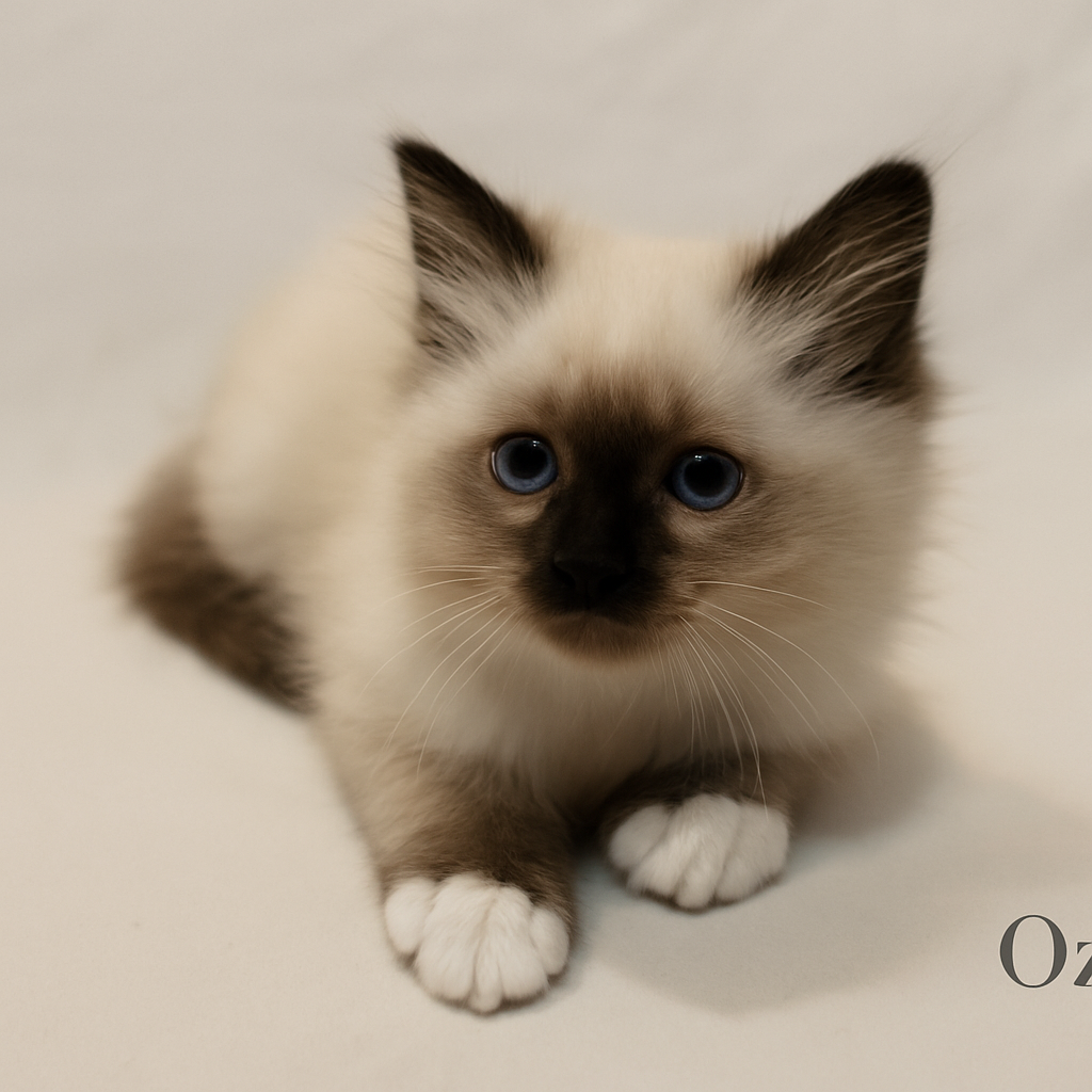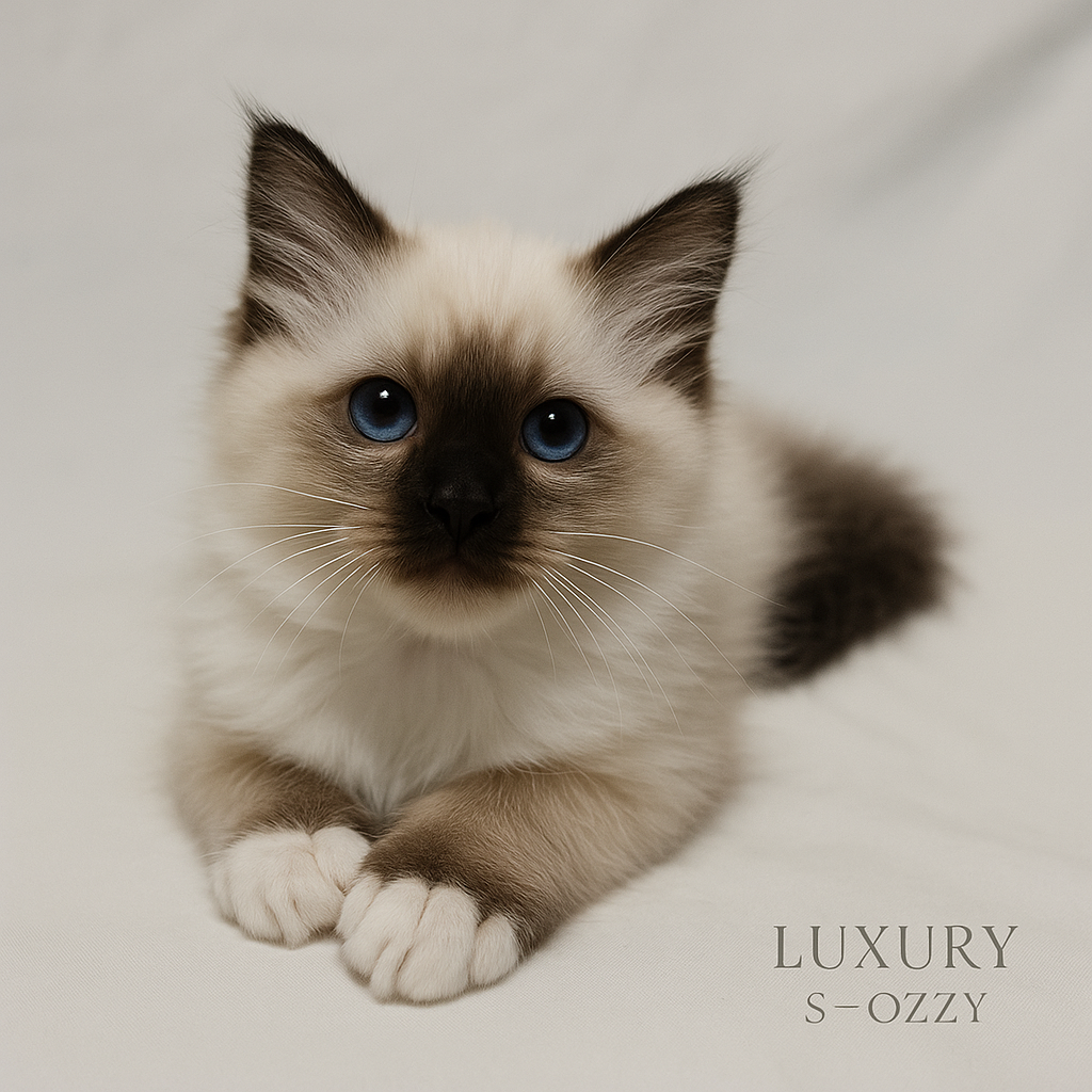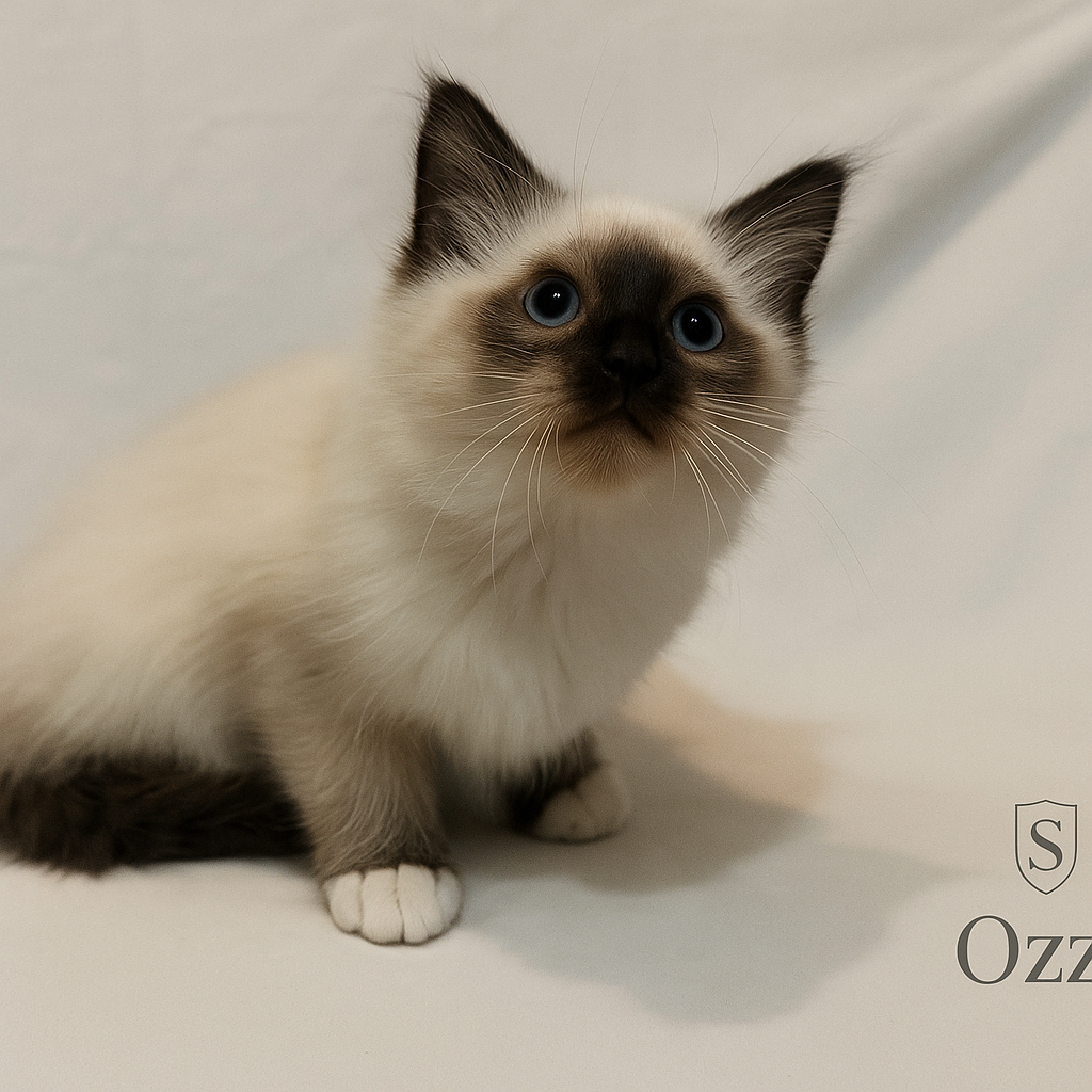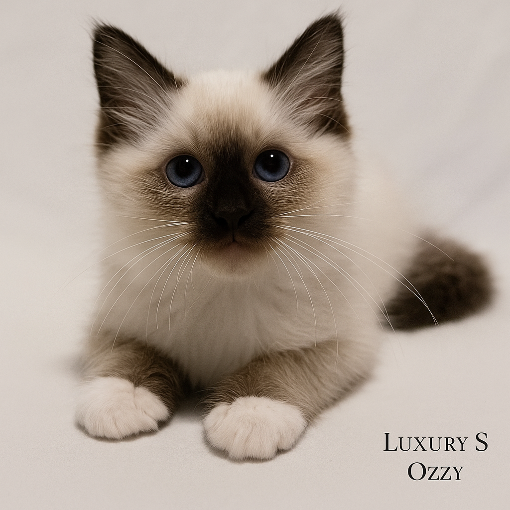Le chaton Birman est un gentil petit compagnon – affectueux, câlin et fidèle. Avec sa nature amicale, il devient rapidement un favori de la famille, toujours là où vous êtes et heureux de partager la vie quotidienne avec son propriétaire. Intelligent, joueur et équilibré, il est à la fois un compagnon calme et un joyeux compagnon de jeu. Je recommande Ozzy pour l’élevage et l’exposition en raison de son excellent pedigree d’exposition et de ses lignées gagnantes.