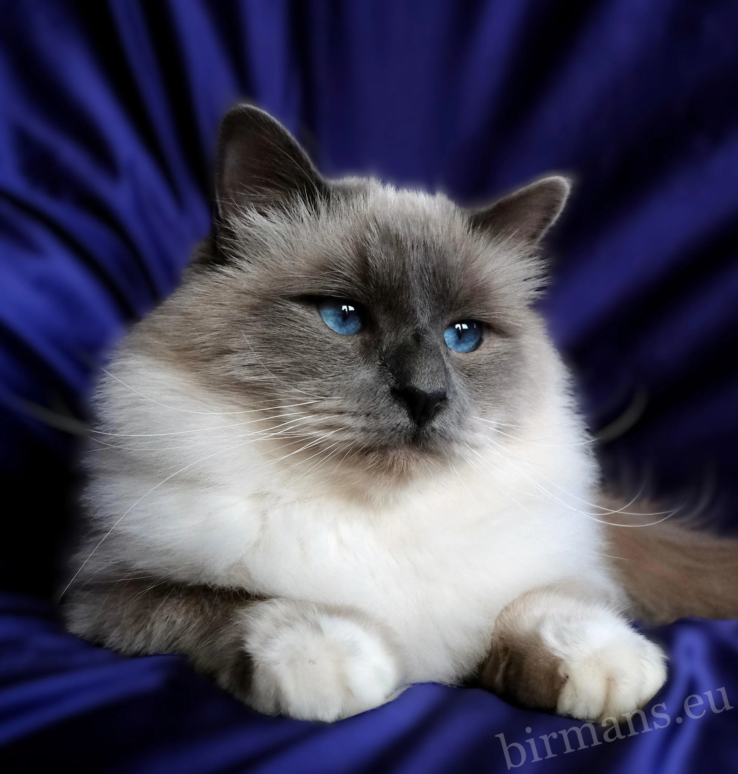 WCH Azzurro dei Baffi Buffi of Saba – Mâle Birman Blue Point. Le mâle emblématique de l'univers Saba Birman, représentant l'élégance de la race et la plus haute qualité au niveau des expositions internationales.